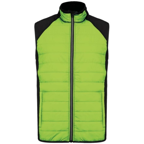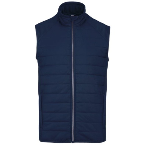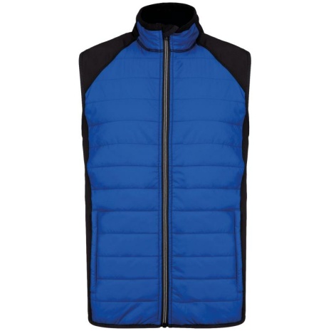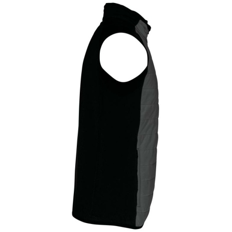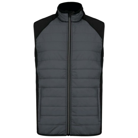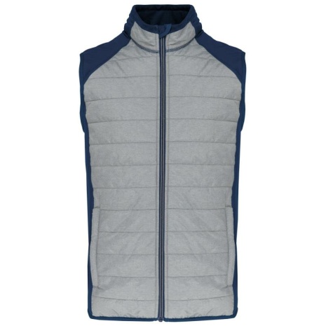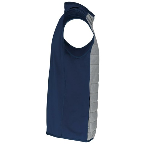 BODYWARMER BI-MATERIAAL 100% ripstoppolyamide : heel sterk Waterafstotende behandeling Heel comfortabele stof. Buitenkant: 100% polyamide ripstop body met waterafstotende behandeling; zijkanten en achterkant 90% polyester / 10% elasthan. (Marl Grey / Sporty Navy: 100% polyester). Binnenvoering: 100% polyester. Ultra comfortabel materiaal. 2 zakken met rits aan de voorzijde. Contrasterende ritssluiting. Elastisch aan mouwuiteinden en onderkant. 1 drukkersrits aan de hartzijde.