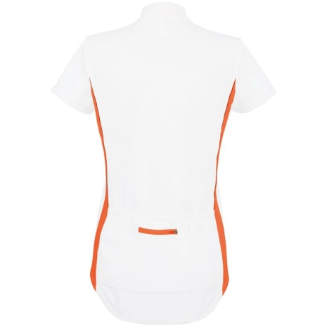 Dames-fietsshirt Korte Mouwen 100% polyester. Ritssluiting. 3 verdeelde zakken op de achterkant + 1 zakje met rits. Onderkant elastisch met anti-slip band van silicone. Reflecterende details op de inzetstukken op de voor-en achterkant.