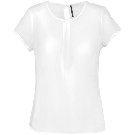 Damesblouse in crêpe met korte mouwen Soepel vallend model en lichte stof, voor een chique en minimalistische stijl. Een onmisbaar, vrouwelijk stuk uit de professionele garderobe. Ronde hals met fronsjes voor een eenvoudige, elegante look. 100% polyester. Soepele en lichte crêpe. Ronde hals. Fronsjes aan de halsopening aan de voorkant. Sluiting aan de achterzijde met een afgedekte knop.