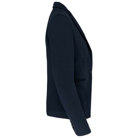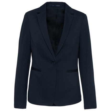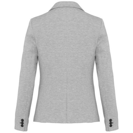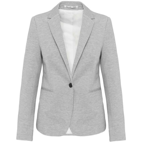Damesjas van tricotย Licht en comfortabel. De klasse van een blazer en het comfort van tricot, voor een casual businesslook. 80% polyester / 18% katoen / 2% elasthan (Night navy heather) – 74% polyester / 24% viscose / 2% elasthan (Light grey heather). Interlock. Voering lichaam van polykatoen en mouwen van taffetas polyester. Jas met 1 knoop. 2 omzoomde zakken aan de voorkant. 1ย binnenzak met knoop. Contrasterende bies aan de binnenkant vooraan. Mouwuiteinde met 3ย knopen, waarvan 1 met contrasterend knoopsgat. 1 ruimtesplit op de achterkant. 1 blinde drukkersrits binnenin aan de voorkant links.