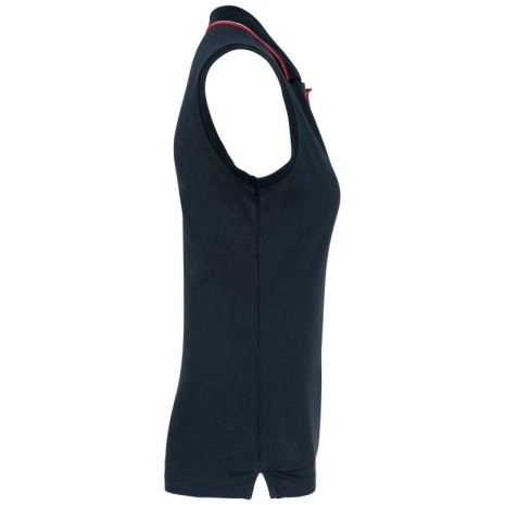 Damespolo zonder mouwenย Klassieke en elegante stijl. V-vormige polokraag afgewerkt met fijne streepjes. Gemaakt uit piquรฉtricot van gekamd katoen. 100% katoen. Katoenen, gekamd piquรฉtricot. Kraag en lijst zonder knoopjes in ribboord met contrasterende biesjes. Contrasterende nektape aan hals en zijsplitten. Mouwopeningen in toon-op-toon ribboord. Dubbel stiksel aan de onderkant.