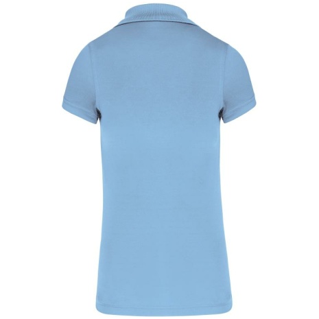 Damessportpolo 100% interlockpolyester: heel sterk, licht en ademend. Sneldrogende stof. Contrasterende nektape aan hals en zijsplitten. 100% polyester interlock. Sneldrogende stof. Kraag in rib. Knooplijst met 3 knopen. Nektape en zijsplitjes in contrastkleur. Contrastkleurige bies op de schouders. Afwerking met dubbele stiksels aan de mouwuiteinden en onderaan.