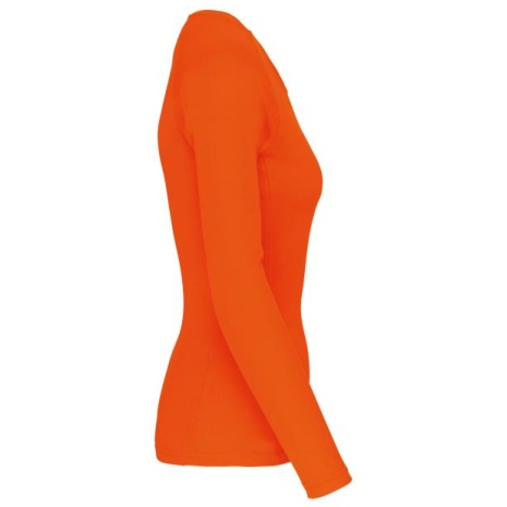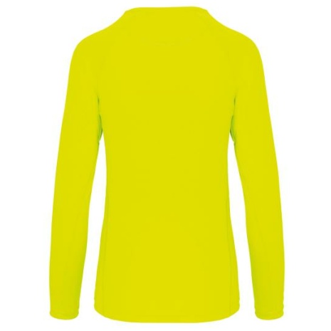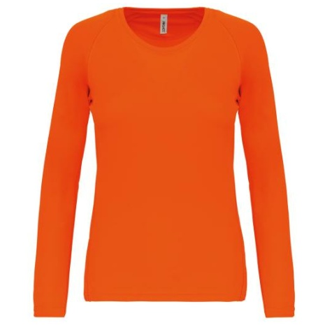 Damessportshirt Lange Mouwen Lichte en sneldrogende stof. 100% polyester : heel sterk, licht en ademend. Ronde halsopening met nektape aan de binnenkant. 100% polyester. Sneldrogende lichte stof. Ronde hals. Nektape. Afwerking met dubbele stiksels aan de mouwuiteinden en onderkant.