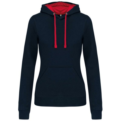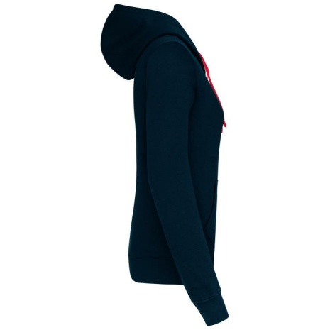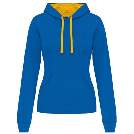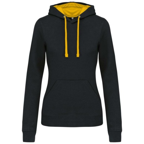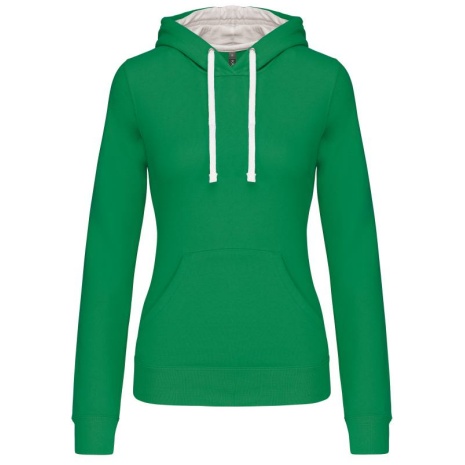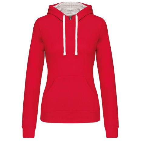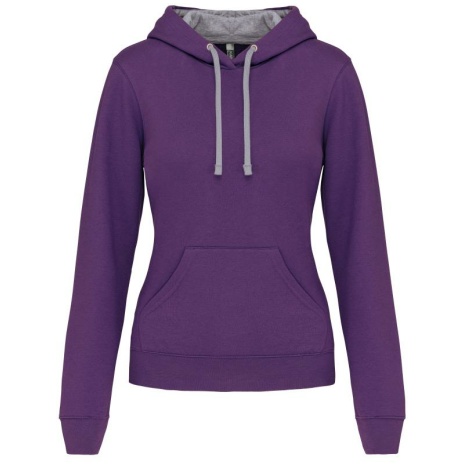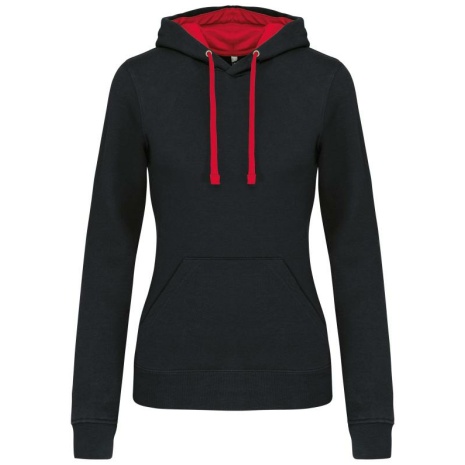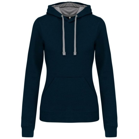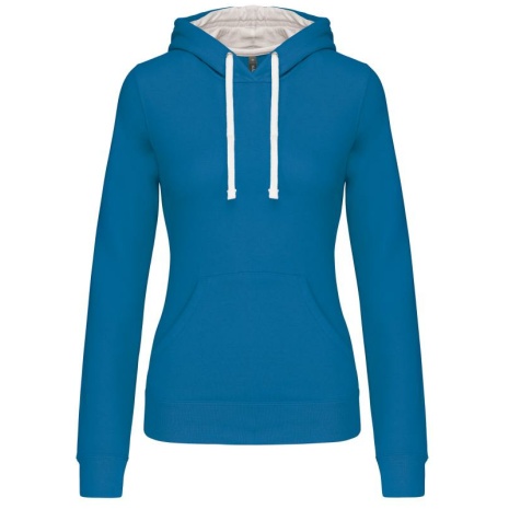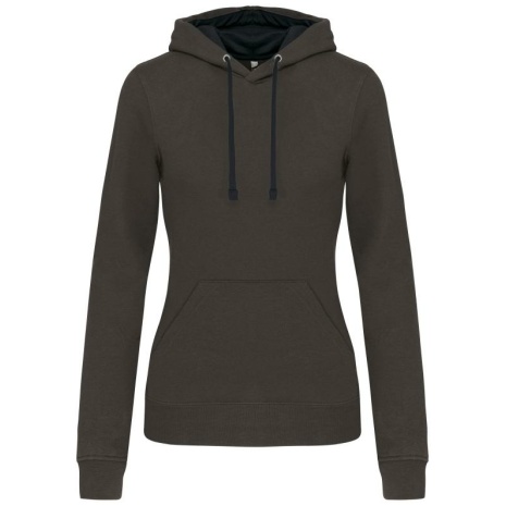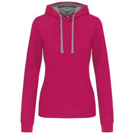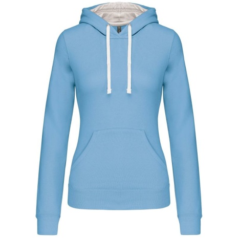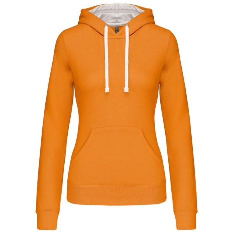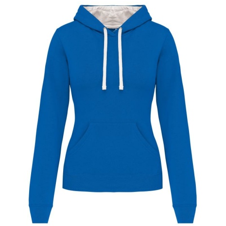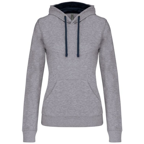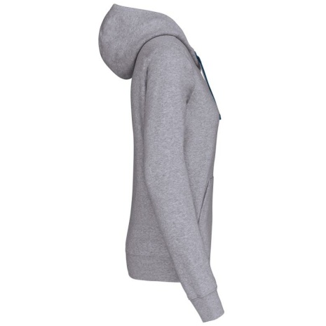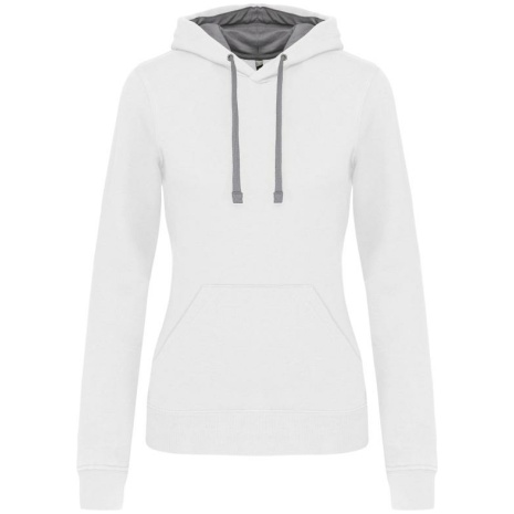 Damessweater met capuchon in contrasterende kleur Tweekleurige sweater met capuchon, voor een casual look. Geborsteld fleece aan de binnenkant, voor een optimaal comfort. Snoeropening voor headset in de kangoeroezak en halsopening. 80% gekamd katoen / 20% polyester (Oxford Grey: 76% gekamd katoen / 21% polyester / 3% viscose). Geborsteld fleece aan de binnenkant. Gaatje voor draadje in de kangoeroezak en lusje aan de kraag voor oortjes. Ribboord aan mouwuiteinden en onderkant kledingstuk. Gevoerde capuchon in contrasterende kleur met aanrijgkoordjes.