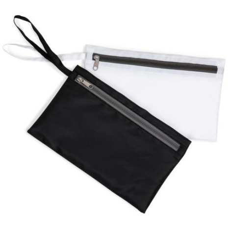 Dubbel compartiment zakje, waarvan één waterdicht. Dubbel vak, waarvan één in waterdichte stof.