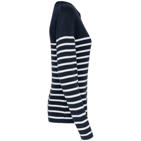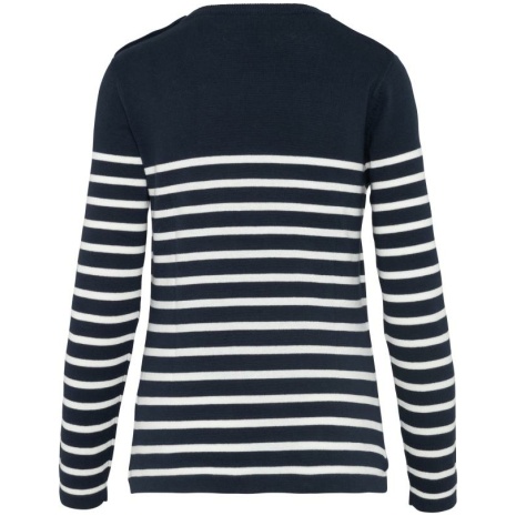 Gestreepte damestruiย Tijdloze en klassieke gestreepte trui. Moderne snit voor een casual-chique look. Collectie Sailing. Gemaakt uit 100% katoen. 100% katoen. Gauge 12. Schouderopening links met 3 toon op toon knopen. 1×1 ribboord aan de halsopening. Gebreide mouwuiteinden en onderkant kledingstuk in dubbele dikte.