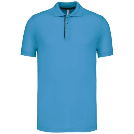 Heren piqué sportpolo Nektape in contrasterende kleur aan de halsopening. Zijsplitten voor meer gemak. Ademende stof. 95% polyester / 5% elasthan. Ademende en anti-statische stof. Piqué. Kraag in rib. Knooplijst met 3 knopen en gecontrasteerde bies. Nektape en zijsplitjes in contrastkleur. Afwerking met dubbele stiksels.