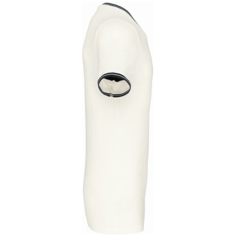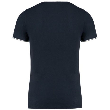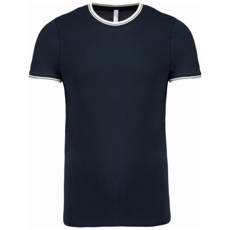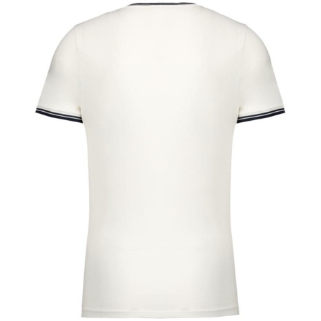 Heren-t-shirt piqué ronde hals De chique klassieker voor mannen. Ribboord met contrasterende strepen aan kraag en mouwuiteinden. Gemaakt uit piquétricot van 100% gekamd katoen. 100% gekamd katoen piqué. Ribboord met contrasterende strepen aan de kraag en mouwuiteinden. Nektape. Afwerking met dubbel stiksel onderaan.