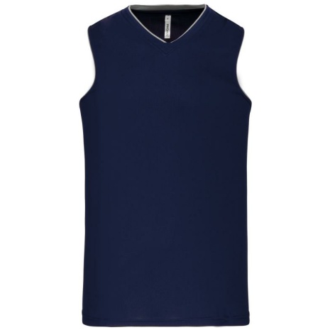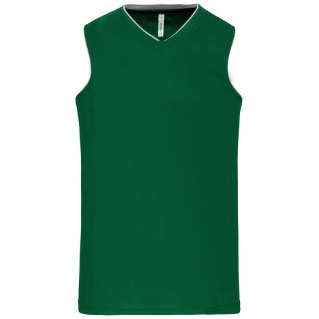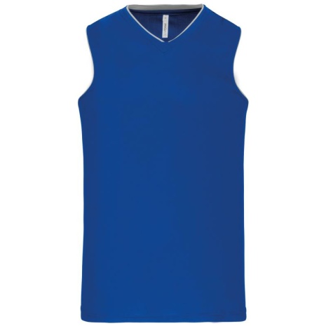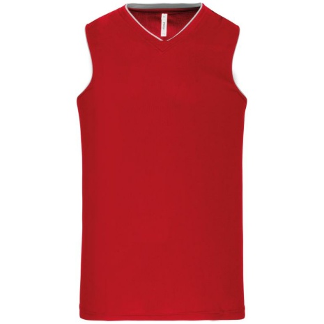 Herenbasketbalshirt 100% polyester: heel sterk, licht en ademend. 100% polyester. V-hals. Bies en oplegsel in contrastkleur. Afwerking met dubbele stiksels onderaan en aan de armsgaten.