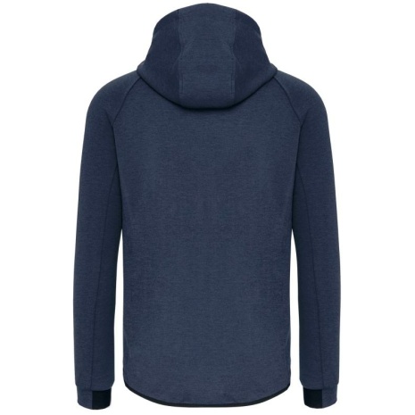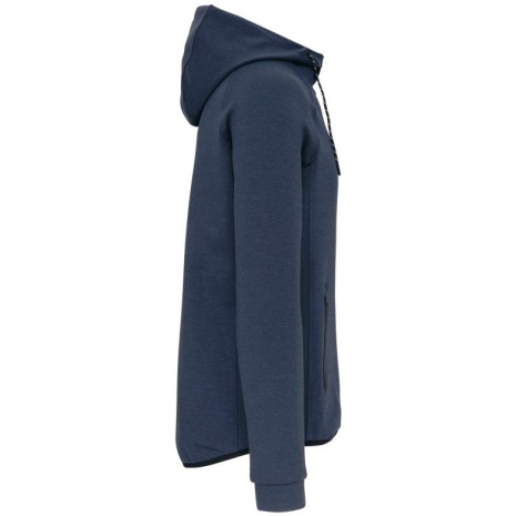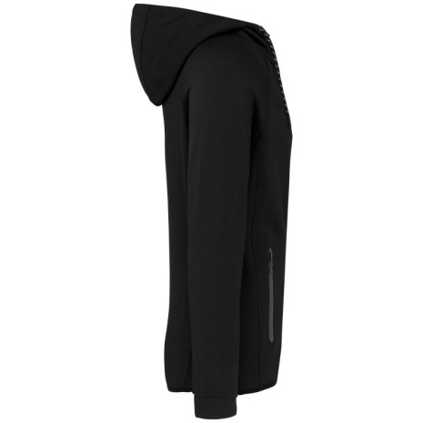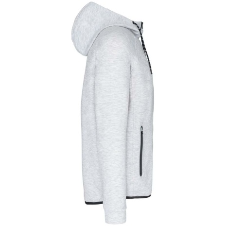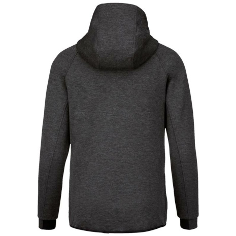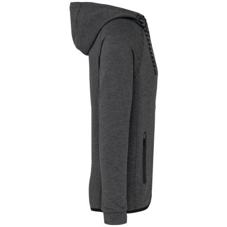 Herenjas met capuchon performance Hele comfortabele stof. Ritssluiting. 2 ritszakken met warmtegelaste afwerking aan de voorkant. 94% polyester / 6% elasthan. (Heather : 79% polyester / 15% viscose / 6% elasthan). Hele comfortabele stof. Ritssluiting. 2 ritszakken met warmtegelaste afwerking aan de voorkant. Capuchon met jerseyvoering van 65% polyester / 35% viscose met tweekleurige aanrijgkoordjes, afgewerkt met een plastic uiteinde. Nauwsluitende mouwuiteinden met een contrasterend, elastisch stuk. Onderkant kledingstuk afgewerkt met een contrasterende zoom. Black op alle kleuren en Dark Grey op de Ash Heather (sluitingen ook).