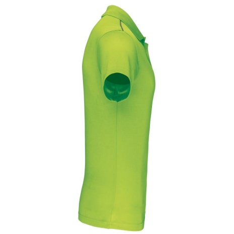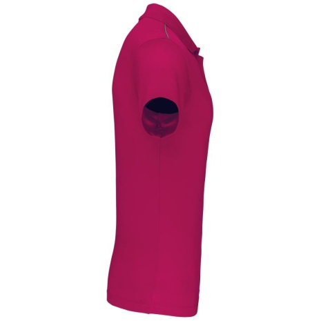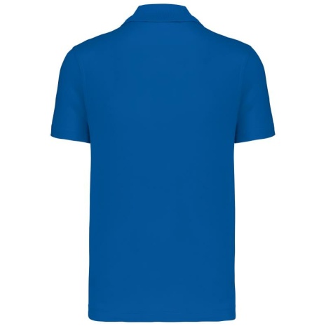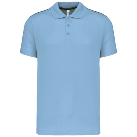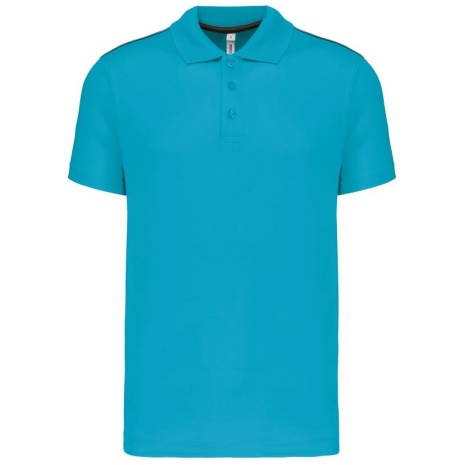 Herensportpolo 100% interlockpolyester: heel sterk, licht en ademend. Sneldrogende stof. Contrasterende nektape aan hals en zijsplitten. 100% polyester interlock. Sneldrogende stof. Kraag in rib. Knooplijst met 3 knopen. Nektape en zijsplitjes in contrastkleur. Contrastkleurige bies op de schouders. Afwerking met dubbele stiksels aan de mouwuiteinden en onderaan.