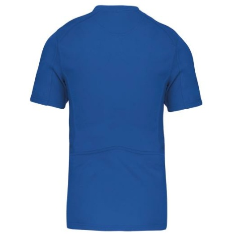 Kinderrugbyshirt Korte Mouwen 100% polyester interlock / Mesh 100% polyester. Inzetstukken in toon op toon mesh op de schouders, aan de zijkanten en onder de armen. Open v-hals. Versterkte naden en scheurbestendig. Afwerking met dubbele stiksels.