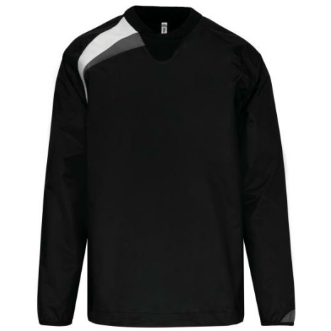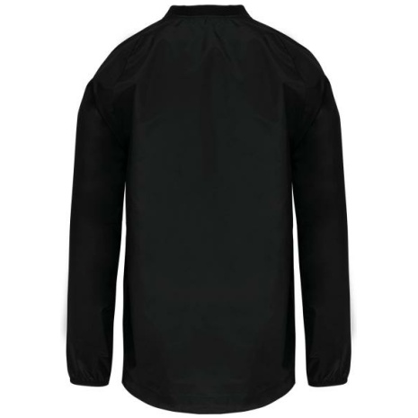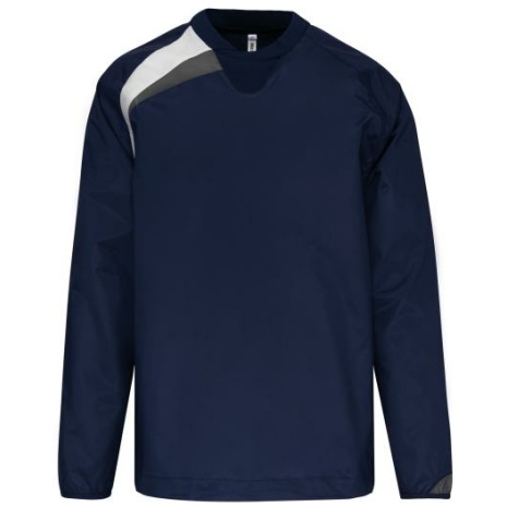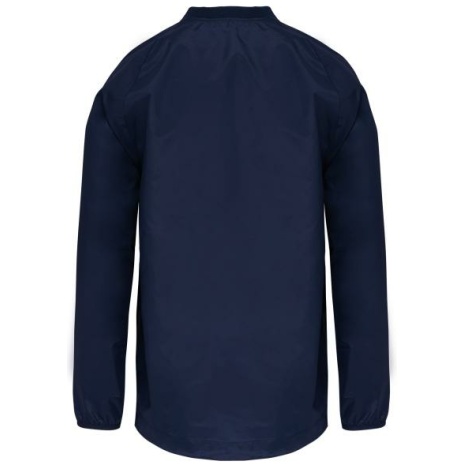 Regen sweater 100% polyamide: heel sterk en scheur- en wrijfbestendig. Waterafstotend. 100% oxford polyamide. PU inductie. Waterafstotend. Ronde hals in rib 1×1 voor het eenvoudig aan- en uittrekken van de sweater. Raglan mouwen. Inzetstukken in contrastkleur op de borst en onderaan de mouwen. Elastisch boord aan de mouwuiteinden. Aanrijgkoord onderaan.