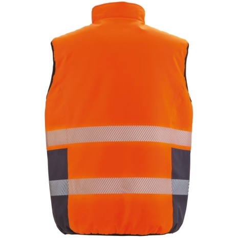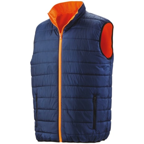 Reversible soft padded safety giletย Membraan dat bestand is tegen schurende stoffen. Soepele, comfortabele stretchstof. Ademend materiaal. Buitenzijde: 100% twillpolyester met mechanische stretch / TPU-laag. Binnenvoering: 100% polyester. Vulling: 100% polyester. Opstaande kraag en ritszakken. Heel zichtbare voorkant: reflecterende stroken op de body. Achterkant: effen met afwerkingen in kleur Navy. Soepel biesje aan de mouwopeningen en op de taille. Eenvoudig op te bergen en compact. Geen merklabel, voor eenvoudige personalisatie. EN ISO 20471:2013+A1 Class 2/RIS-3279-TOM (orange only)