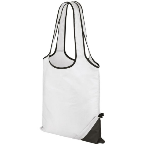 Shopper “compact” Gemakkelijk opbergen – compact. Heel licht om te dragen. Handig om te vervoeren. 100% polyester. Opvouwbare shopper in zak in hoekzak met aanrijgkoord. Verstevigde naden. Contrasterende randen. White : eenkleurige hengsels.