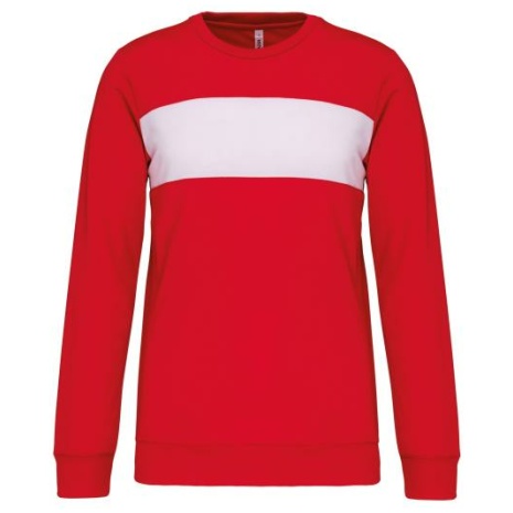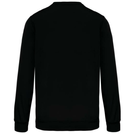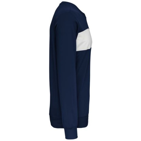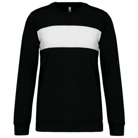 Sweater in polyester kind 100% polyester: heel sterk. Nektape op de binnenzijde van de kraag. 100% polyester. Polytricot. Contrasterende bies van ongeveer 9 cm hoog aan de voorkant. Ronde hals. Nektape op de binnenzijde van de kraag. Ribboord met elasthan aan de kraag, de mouwuiteinden en de onderkant.