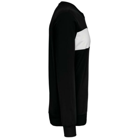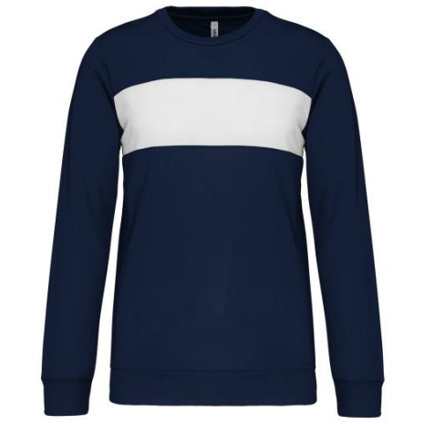 Sweater in polyester 100% polyester: heel sterk. Nektape op de binnenzijde van de kraag. 100% polyester. Polytricot. Contrasterende bies van ongeveer 11,50 cm hoog aan de voorkant. Ronde hals. Nektape op de binnenzijde van de kraag. Ribboord met elasthan aan de kraag, de mouwuiteinden en de onderkant.
