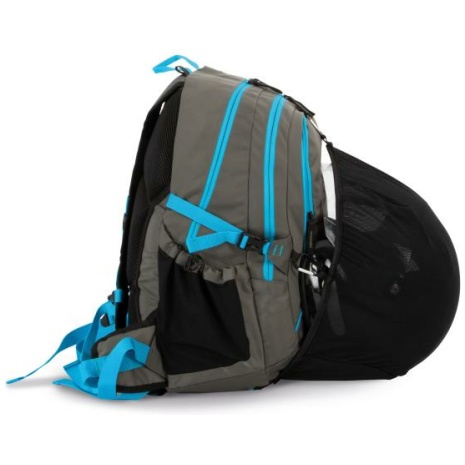 Vrijetijdsrugzak met helmhouder. Afneembaar helmnetje dat kan worden opgevouwen in de speciaal daarvoor voorziene ritszak onder de rugzak.